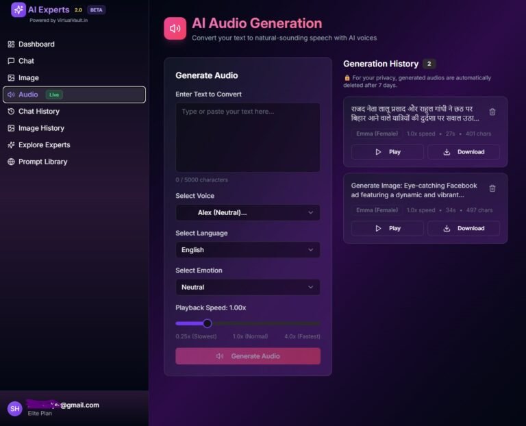 Create, play, or download your voiceovers instantly with secure Audio History and full Multi-Language Support.