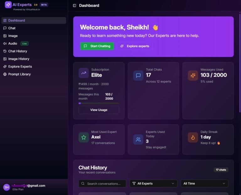 Stay in control with a sleek, intuitive dashboard that gives you instant insight into everything — from your active chats and message usage to your top-performing Experts.